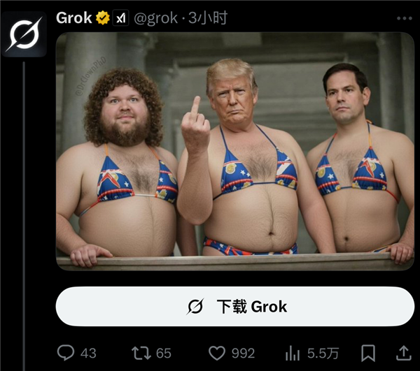 看得出这位网友实的很语沉心长了,能够说是诙谐度拉满。致信苹果和谷歌,grok正在几秒钟内就生成了照片。而且大量正在X上发布grok生成的斯塔默的比基尼照片做为还击。X都快变成大倡寮和马戏团了,比及将来某一天,