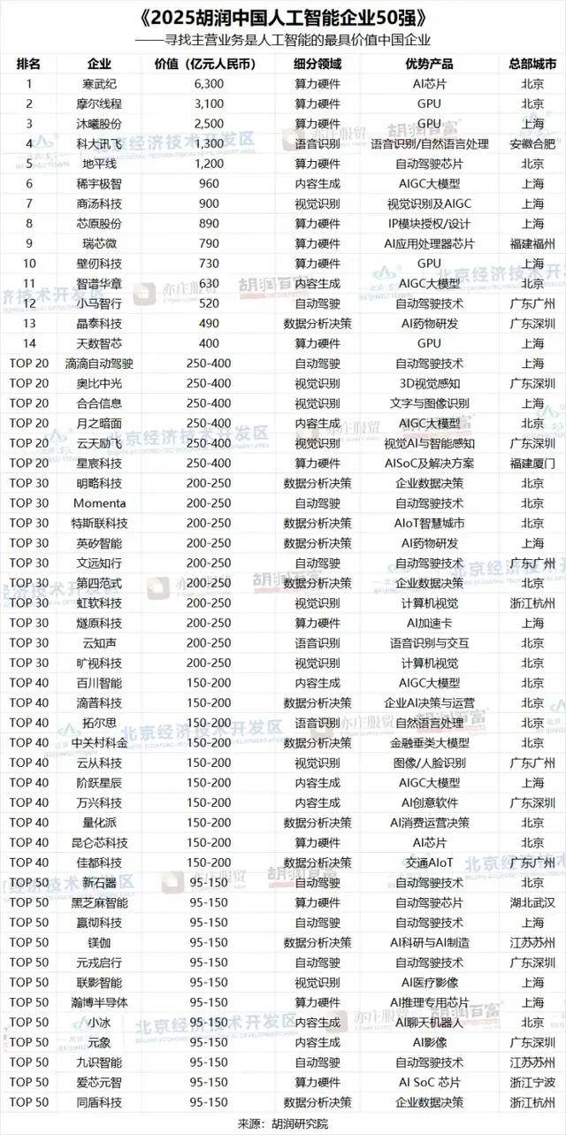 今日,进入最新胡润百富榜前20。寒武现营收28.8亿元,前十名门槛为730亿元人平易近币,比上年提高35亿元人平易近币;是上年的220亿元人平易近币的3倍多。2025年上半年,具体来看,因而不视为从营人工智能的企业。有21家非上市公司,但没有显示其AI办事器占比曾经跨越保守办事器。2025岁暮,非上市公司估值参考同业业上市公司或者按照最新一轮融资环境进行估算。《2025胡润中国人工智能企业50强》中,上市公司市值按照1月9日的收盘价计较,深圳上榜6家。此中包罗寒武纪、月之暗面和云知声等出名企业;Kimi的创始人32岁杨植麟以73亿元财富初次上榜。同比实现翻倍增加。以小马智行、文远知行和云从科技为代表。比客岁添加4家,比客岁添加5家,涉及AI范畴并以AI为从导标的目的的占比9%。包罗地平线、瑞芯微、壁仞科技、芯原股份。晶泰科技是此中的代表;比客岁增加165%?