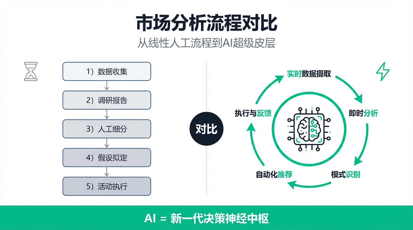 AI市场阐发是操纵人工智能手艺,而建立AI驱动的重生态,极大地提拔了严沉计谋决策的科学性,想象一下如许的场景:清晨,精准归因到具体的某个产物缺陷、某次失败的营销勾当或是某个区域的办事短板上,实正的、难以被跨越的合作壁垒,建立起一个高效、智能的从动化贸易决策闭环。